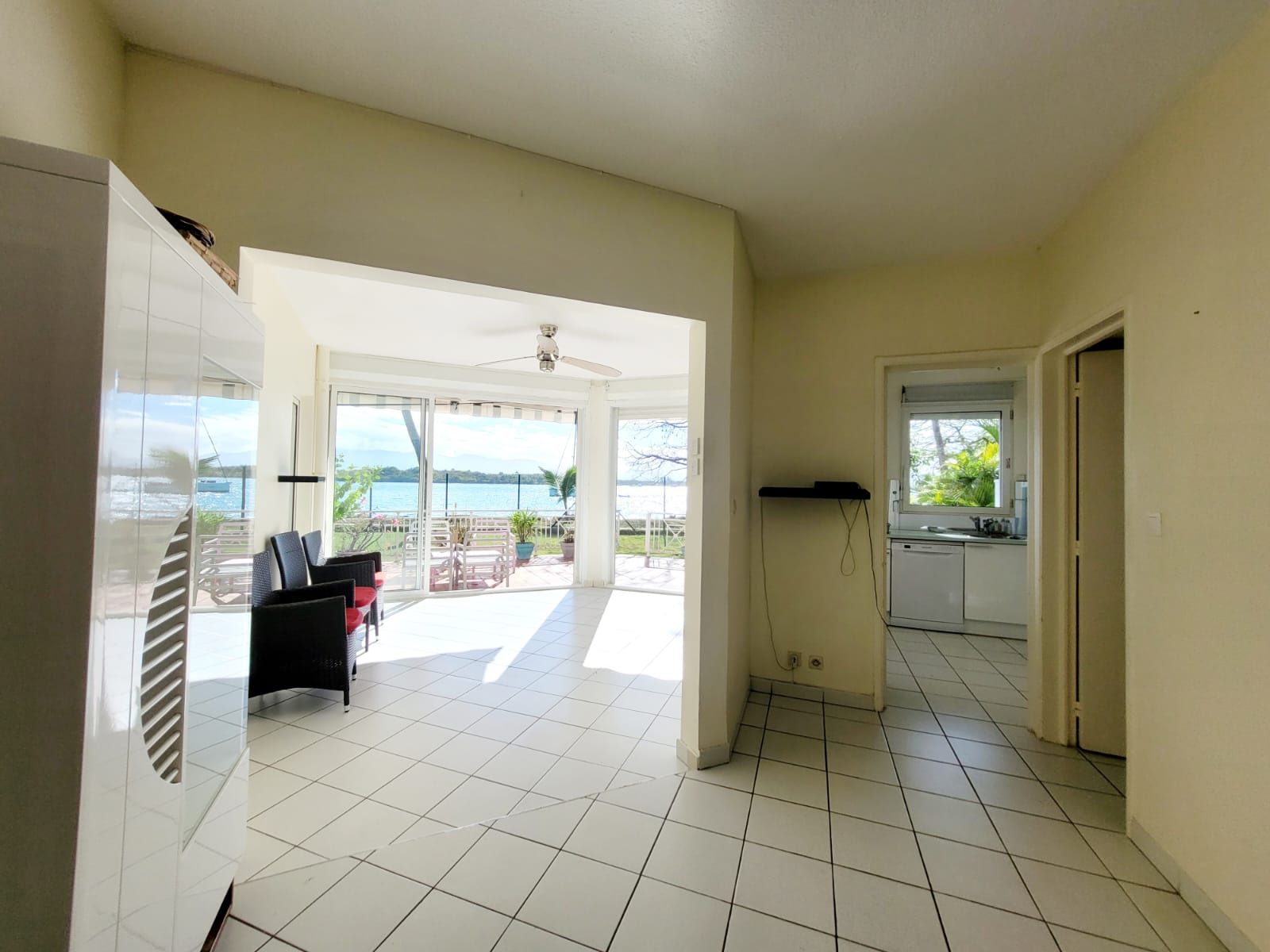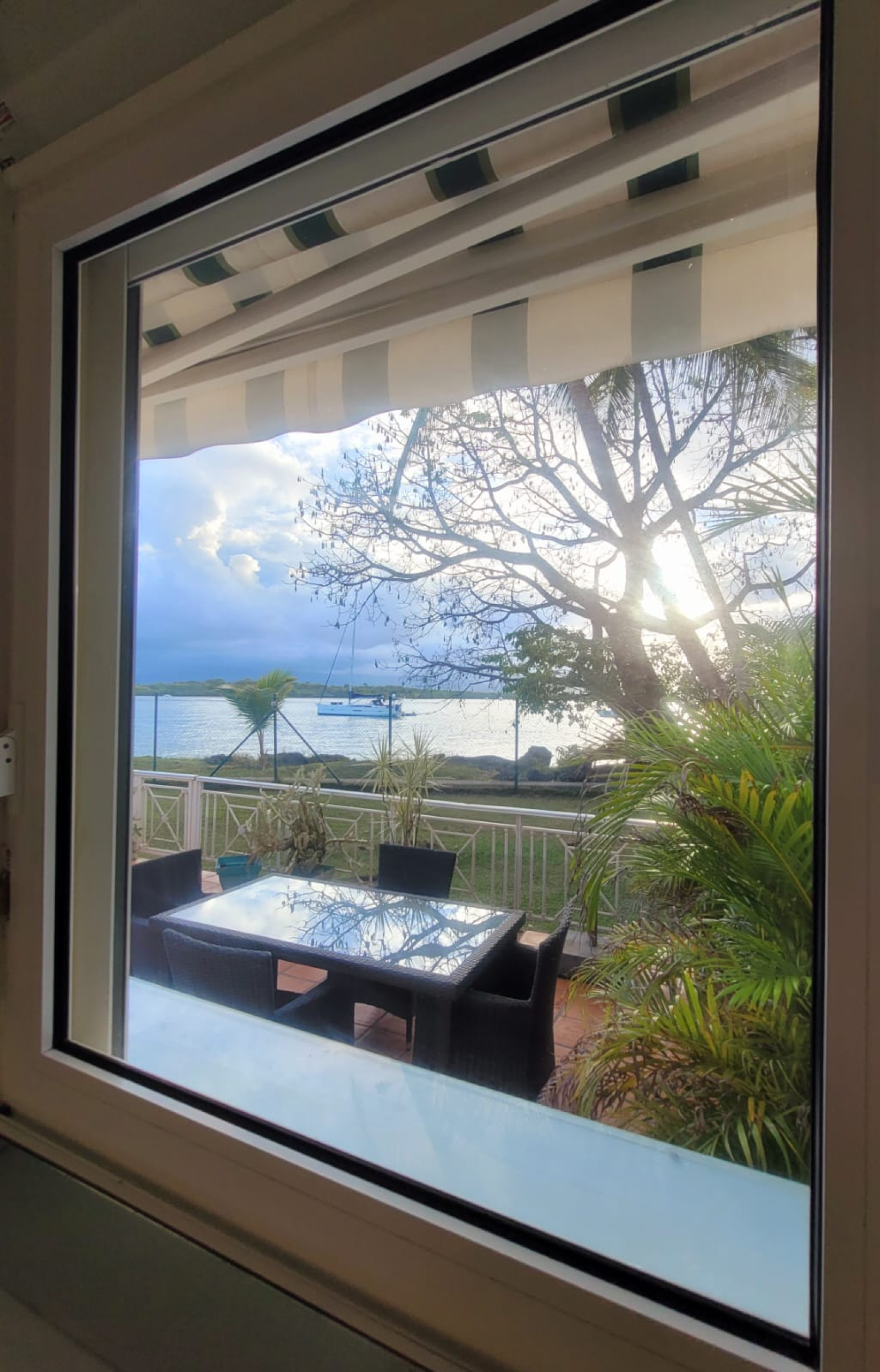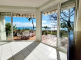 Belle surface d'espace vert devant l'appartement, magnifique vue mer animée par le passage de nombreux bateaux. Possibilité de rentrer directement par la terrasse avec la télécommande du volet roulant.